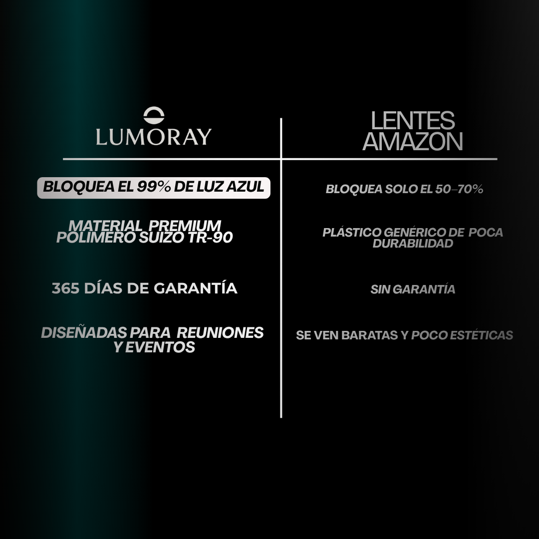 Cómo te ayuda Lumoray™ Los Lumoray™ V1 bloquean el 99% de la luz azul de tus pantallas por la noche. Eso le quita al cerebro el estímulo que lo mantiene “despierto”.